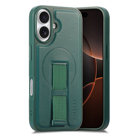 iPhone 16 Hård Plast Skal m. Konstläder Baksida & Fingerrem - MagSafe Kompatibel - Grön