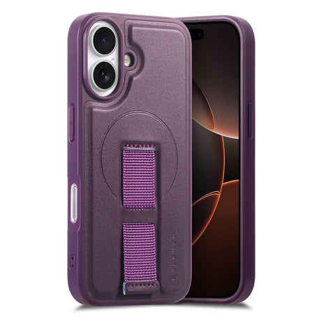 iPhone 16 Hård Plast Skal m. Konstläder Baksida & Fingerrem - MagSafe Kompatibel - Lila