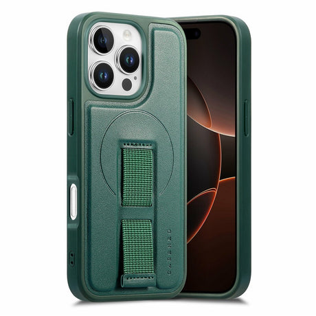 iPhone 16 Pro Hård Plast Skal m. Konstläder Baksida & Fingerrem - MagSafe Kompatibel - Grön
