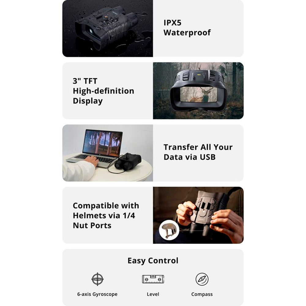 Trots sina avancerade funktioner är denna nattkikare lätt och bärbar med en vikt under 500 gram, vilket gör den enkel att ha med i en väska eller fästa på hjälm, stativ eller rem. Den robusta IPX5 vattentäta designen säkerställer pålitlig användning i alla väderförhållanden.