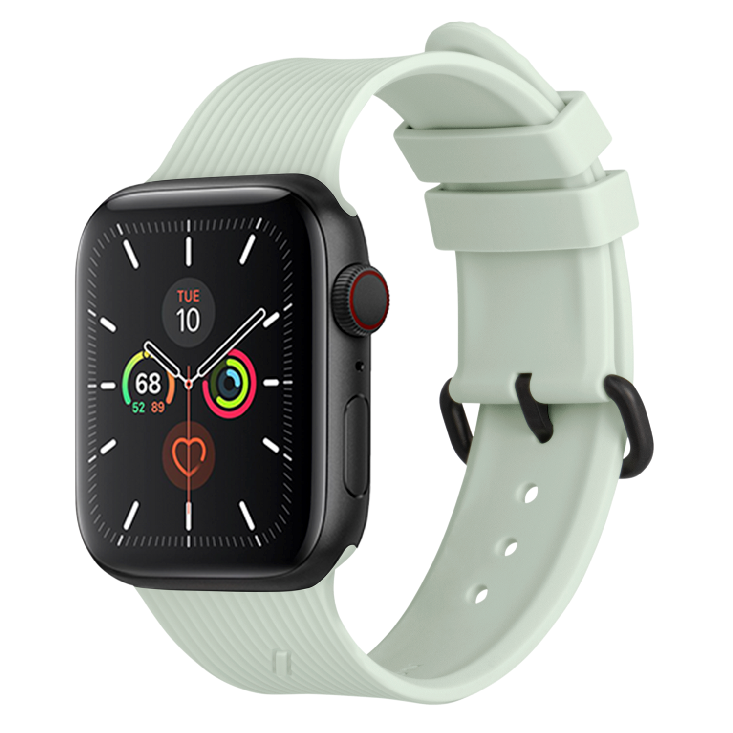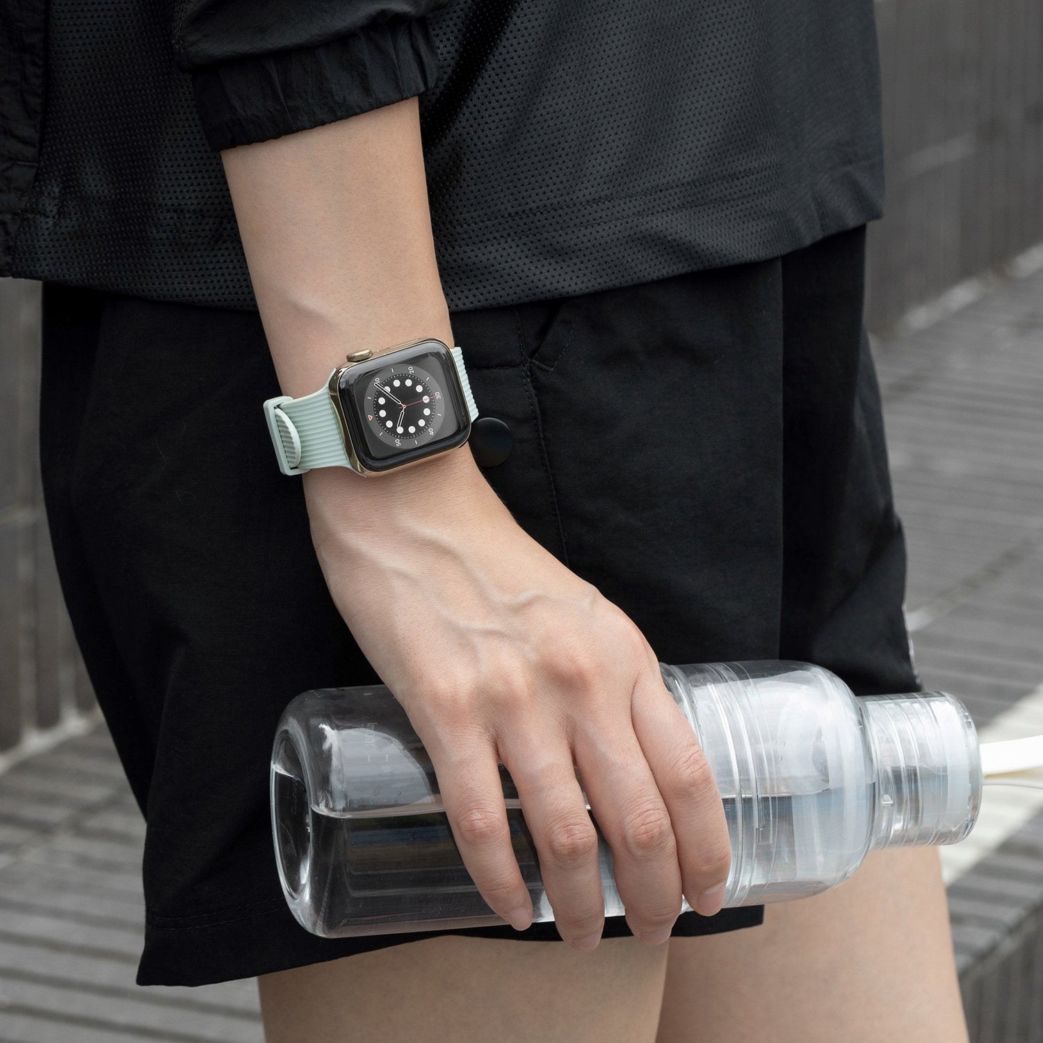 Denna smartwatchrem för Apple Watch (42/44/SE/45/46/49mm) är gjord av ett flexibelt och vattentåligt silikonmaterial som är mjukt vid beröring och kommer inte skava in i huden. På insidan finns upphöjningar som hjälper till att minimera skav och svett när du bär remmen.