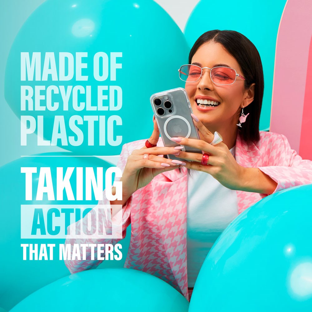 Detta iPhone 16 Plus skal är tillverkat av återvunnen plast och har öppningar för högtalaren, kameran och blixten, samt möjlighet att ansluta laddaren medan skalet är på.