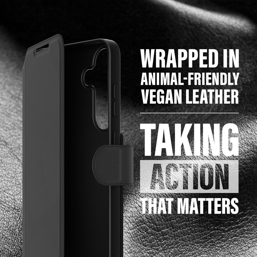 CARE by PanzerGlass är ett välkänt danskt varumärke som erbjuder pålitligt skydd varje gång, och detta fodral är inget undantag. Fodralet är tillverkat av konstläder och flexibel plast, vilket skyddar din telefon både mot daglig slitage och större sprickor eller skador. Flip-delen av fodralet är i konstläder, vilket gör det behagligt att hålla i och ger ett elegant och stilrent uttryck. Den inre delen – där telefonen sitter – är tillverkad av flexibel plast, vilket gör det lätt att sätta på och ta av fodralet, samtidigt som det har en stötabsorberande effekt vid oavsiktliga fall eller stötar. Risken för skador, stora som små, på din smartphone minskas alltså avsevärt med detta Samsung Galaxy S25+ (Plus)-fodral.