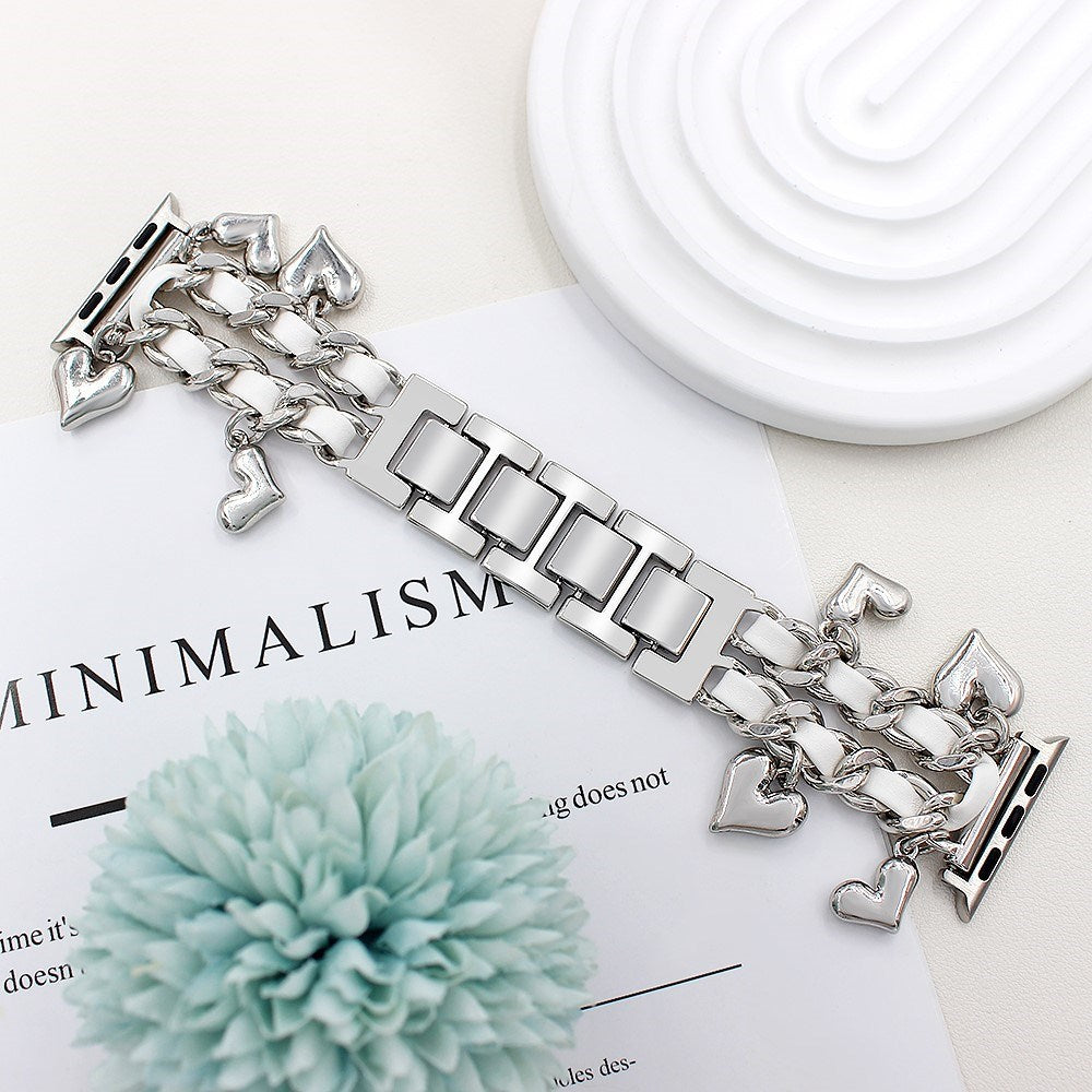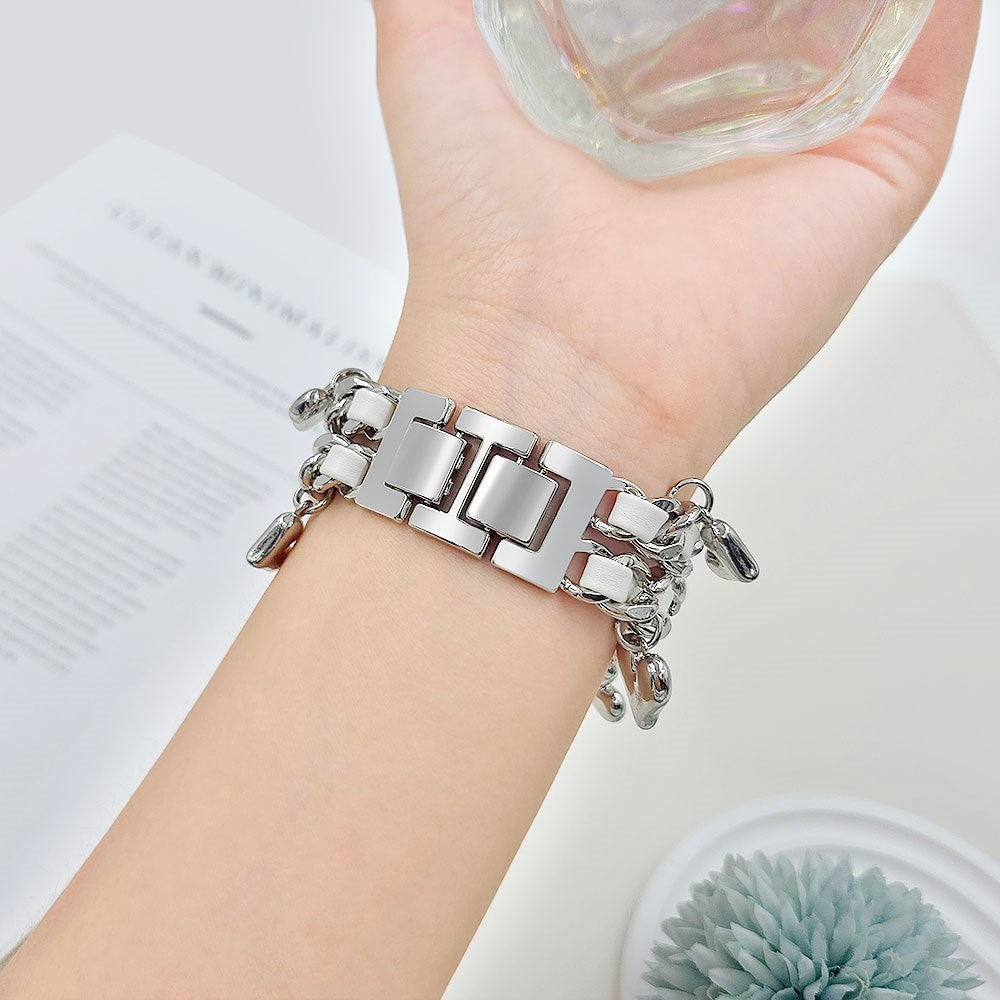 Apple Watch (42 / 44 / SE / 45 / 46 / 49mm) Metall Rem m. Konstläder & Hänge - Silver / Vit