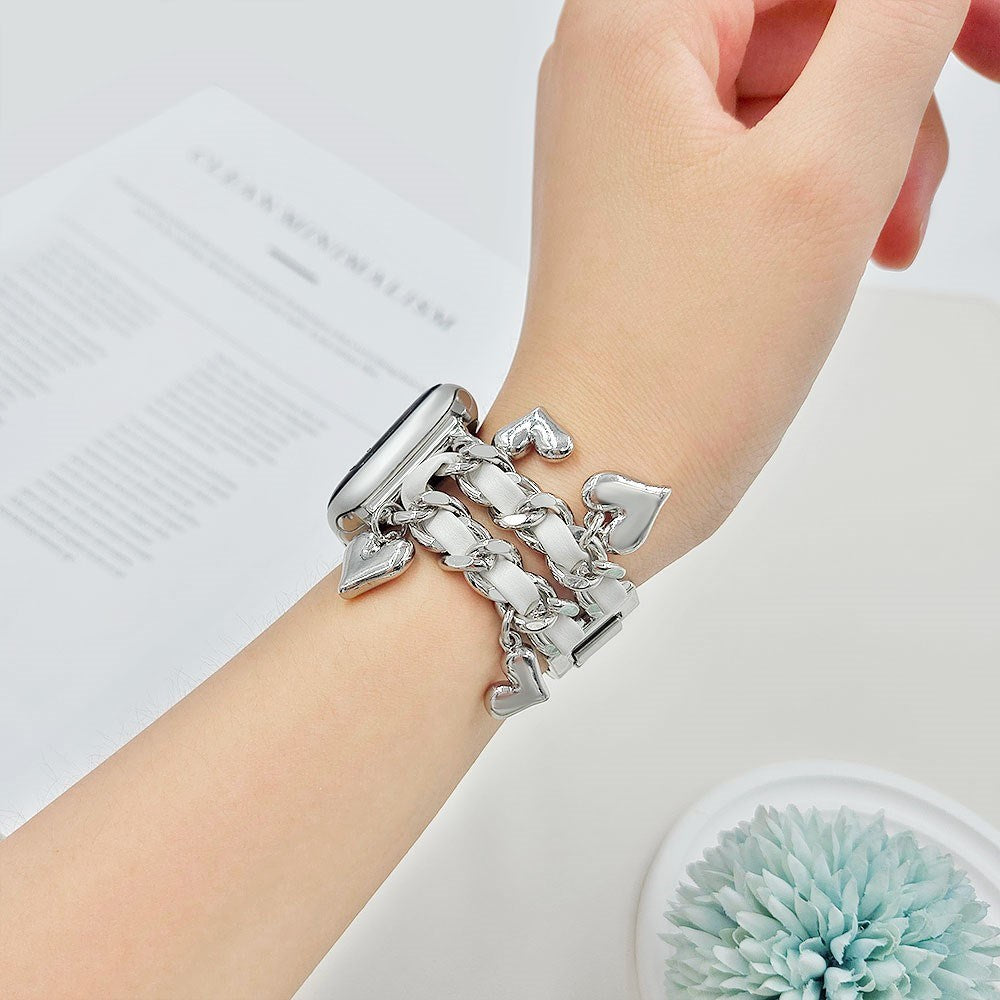 Lägg till en touch av elegans och romantik till din handled med EIDERWOODs Metalrem till Apple Watch (42 / 44 / SE / 45 / 46 / 49mm). Detta armband kombinerar en stilfull blandning av metall och konstläder i en tvinnad kedjedesign, vilket gör det till ett iögonfallande accessoar som fångar uppmärksamhet. Designat med vackra fjäril- och blommhänge, ger remmen både charm och femininitet till din look.