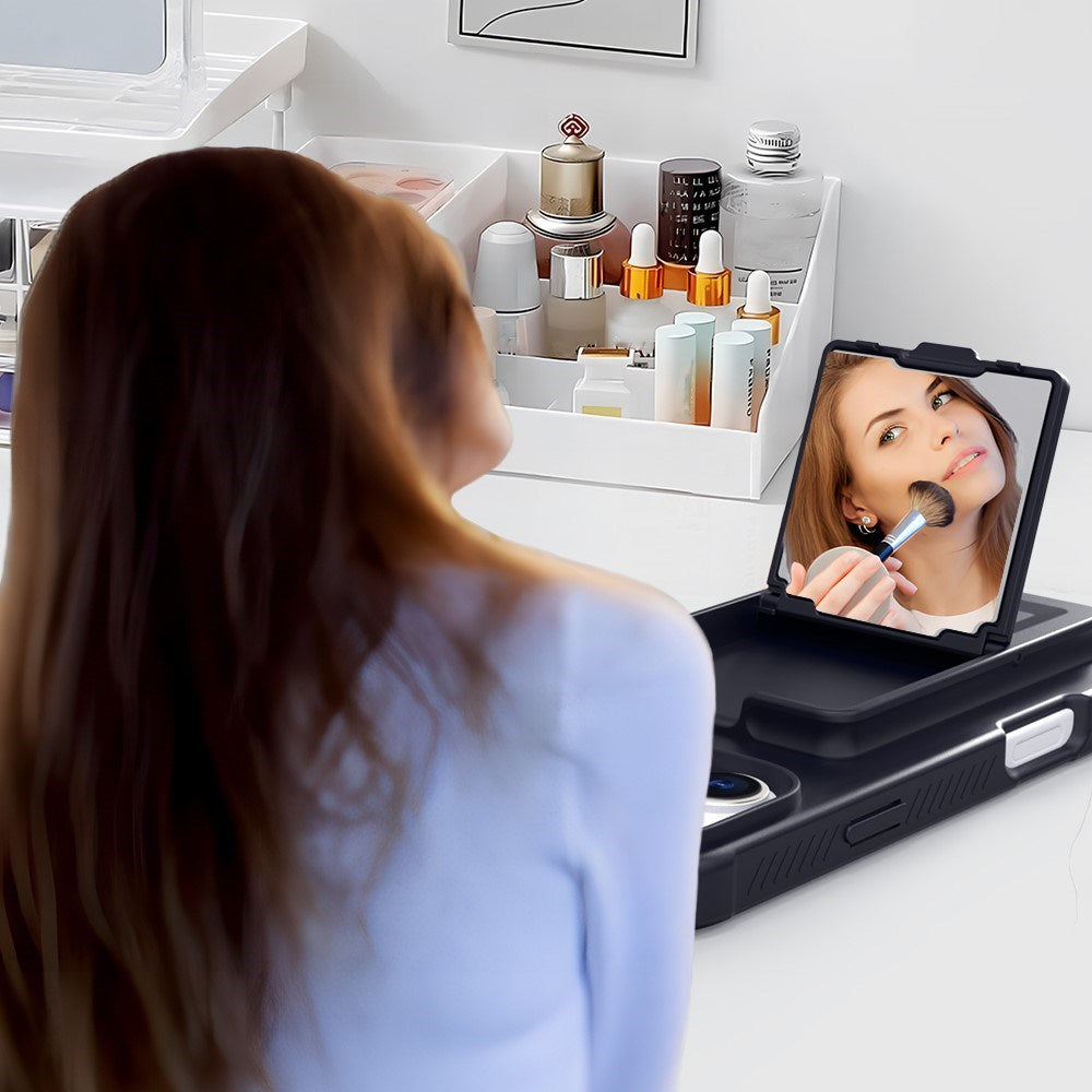 På insidan av korthållaren sitter även en liten spegel som gör det enkelt att snabbt kontrollera håret eller om något fastnat mellan tänderna. När spegeln är utfälld kan den även användas som ett stöd, så telefonen kan stå på egen hand – perfekt för t.ex. att titta på film.