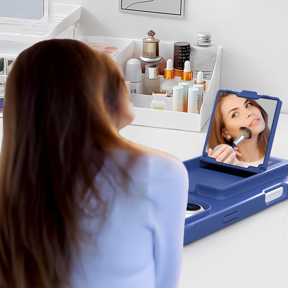 iPhone 16 Pro Flexibelt Plast Skal med Korthållare & Inbyggd Spegel – Blå