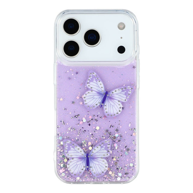 Inuti detta iPhone 17 Pro skal sitter två vackra fjärilar som pryder fodralet. De är omgivna av glitter som skapar ett unikt utseende när ljuset träffar dem.