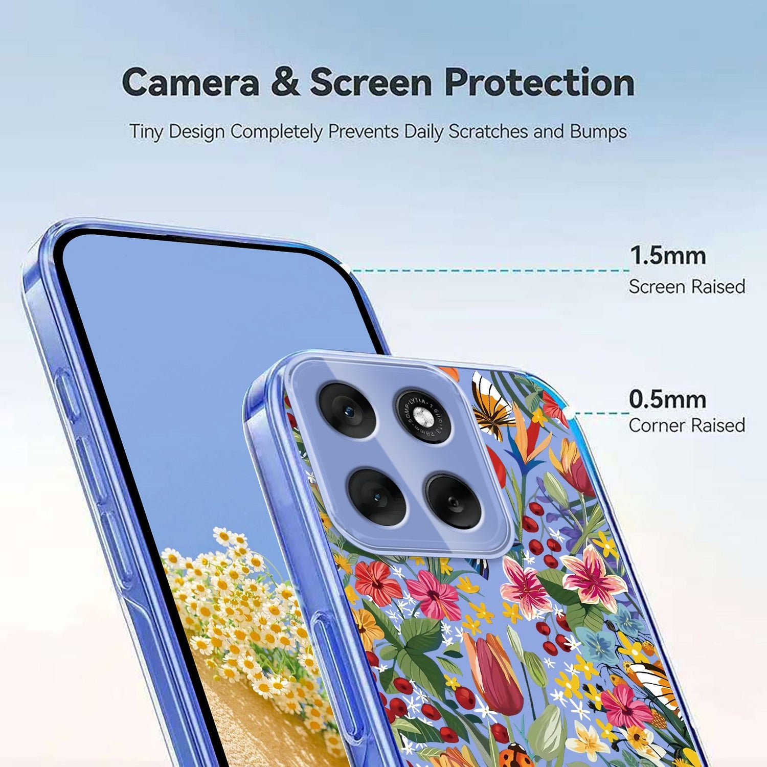 - Upphöjda kanter runt skärmen och bakre kameran