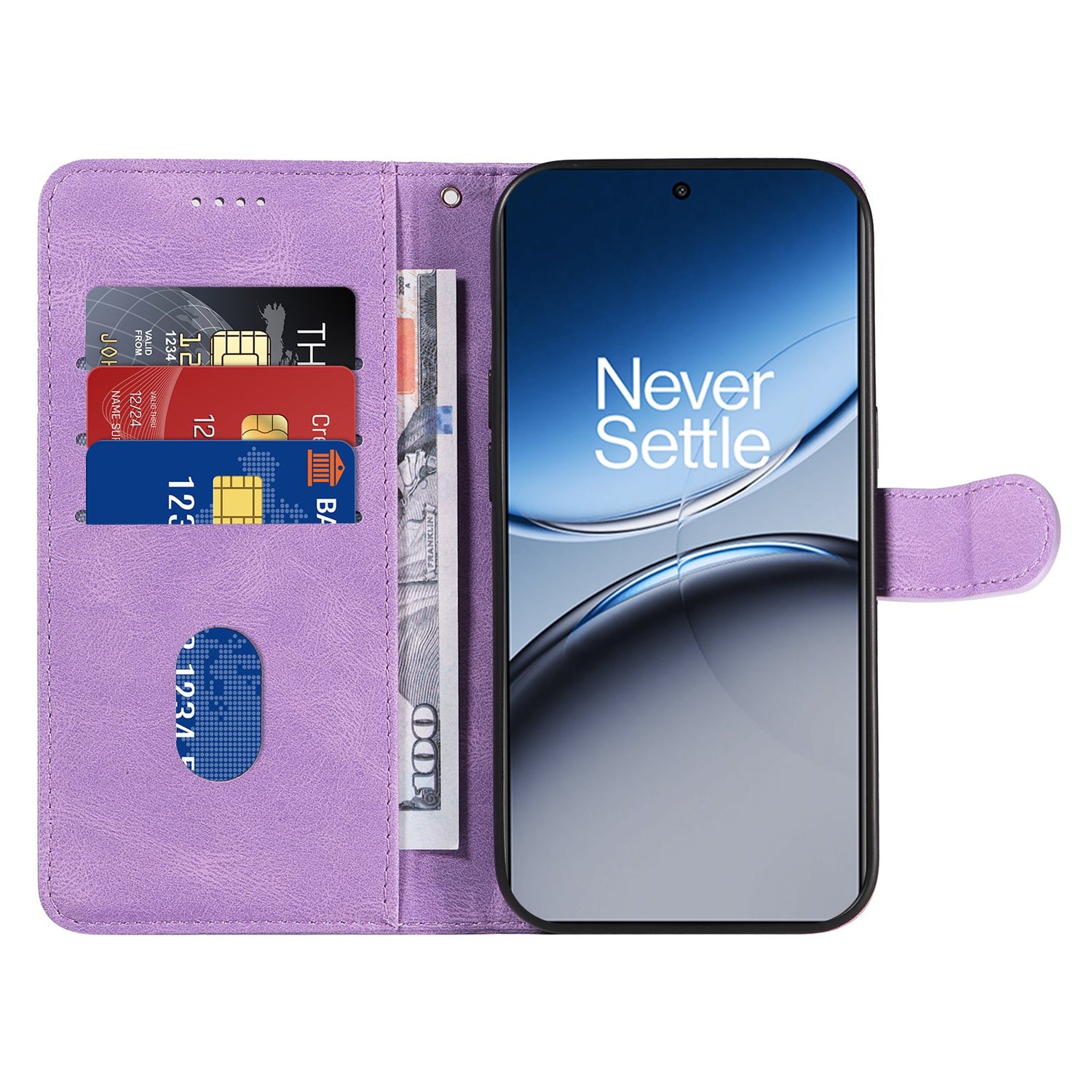 Detta fodral för OnePlus Nord 4 öppnas och stängs med ett magnetlås. På insidan, på ena sidan, hittar du ett flexibelt plastskal där telefonen ska placeras. På andra sidan finns tre kortfack samt en ficka för sedlar. Fodralet har också en ställfunktion, så att du alltid kan streama din favoritfilm direkt från din telefon.