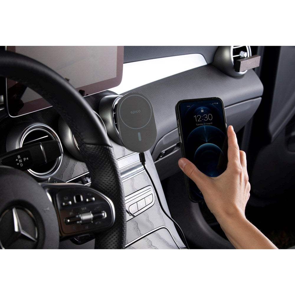 Här får du en praktisk och smart Epico Magnetisk Mobiltelefonhållare med 15W trådlös laddning till bilen, som är MagSafe-kompatibel. Hållaren är enkel att installera och fästs i bilens ventilationsuttag. På så sätt ser du till att din mobil och hållaren sitter kvar, även under långa resor med många gupp. Mobilinnehavare m. trådlös laddning kan vridas 360° så att den alltid sitter i den vinkel du vill ha. Den är perfekt att ha i bilen för till exempel handsfreesamtal, GPS och när man saknar ström.