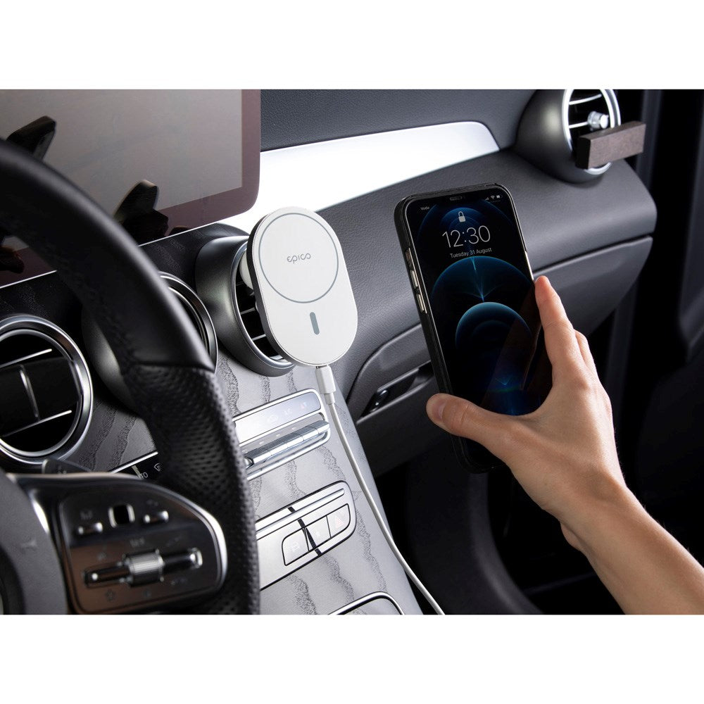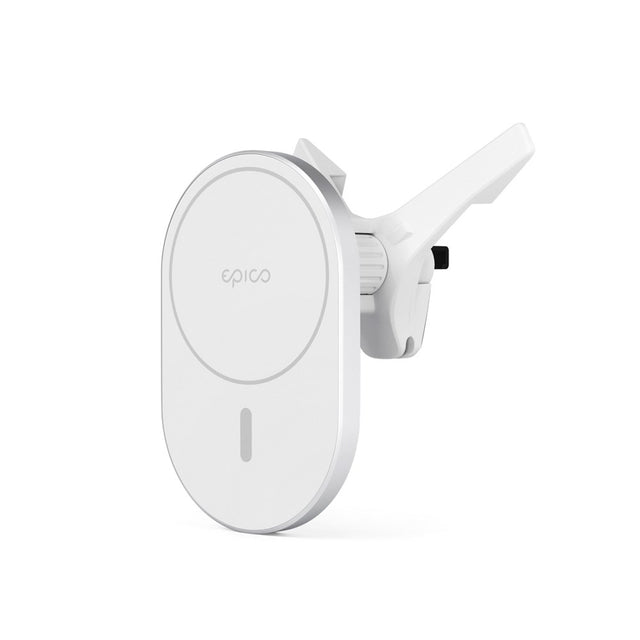 Här får du en praktisk och smart Epico Magnetisk Mobiltelefonhållare med 15W trådlös laddning till bilen, som är MagSafe-kompatibel. Hållaren är enkel att installera och fästs i bilens ventilationsuttag. På så sätt ser du till att din mobil och hållaren sitter kvar, även under långa resor med många gupp. Mobilinnehavare m. trådlös laddning kan vridas 360° så att den alltid sitter i den vinkel du vill ha. Den är perfekt att ha i bilen för till exempel handsfreesamtal, GPS och när man saknar ström.