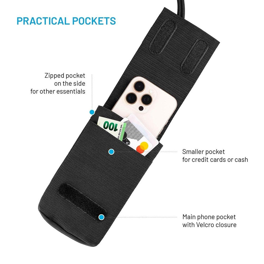 Väskan är tillverkad av 600D RPET, ett slitstarkt och återvunnet material som bidrar till en hållbar livsstil. Den har ett huvudfack med säker kardborrestängning som skyddar din telefon mot stötar och repor.