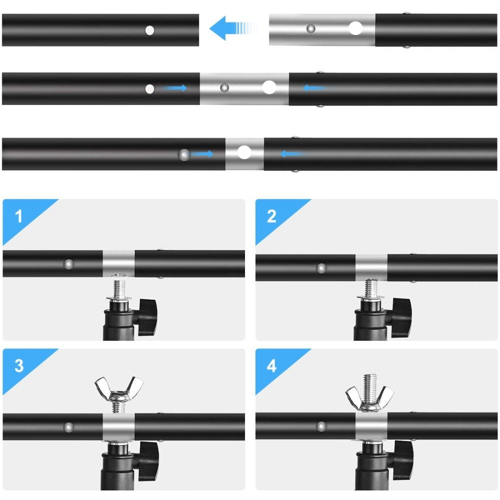 T-stativets design med endast ett stativ bakom bakgrunden sparar utrymme och gör uppsättningen snabb och enkel. Trots den enkla konstruktionen kompromissar du inte med stabiliteten – stativet står stadigt, och bakgrunden hålls på plats med hjälp av de medföljande klämmorna.