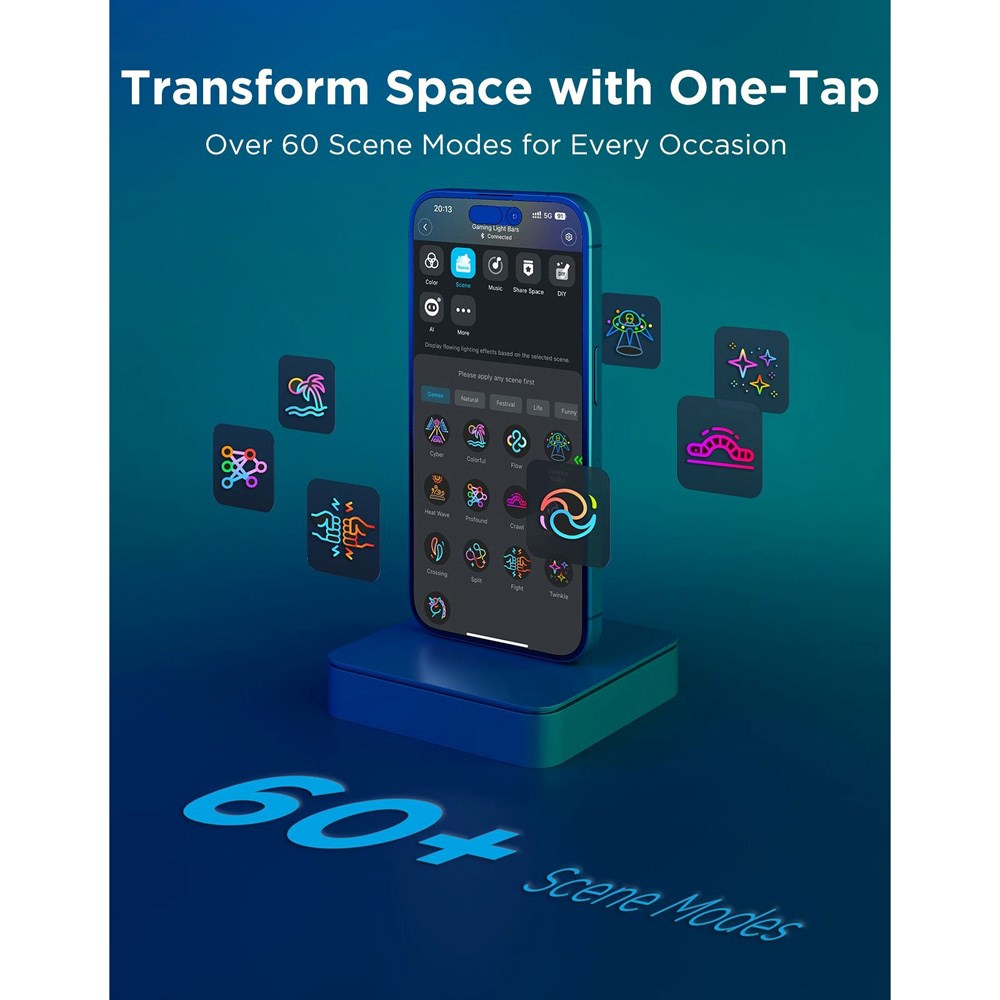 Varje ljusstav har en innovativ tredelad design som sprider ljus framåt, nedåt och bakåt för maximal djupkänsla och intensitet. Med RGBIC-teknologi får du tillgång till över 16 miljoner färger, som kan kombineras och styras individuellt i varje ljuszon.