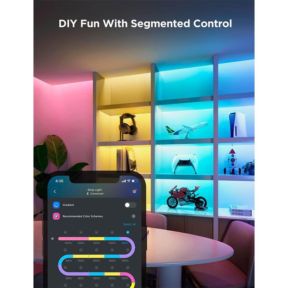 - DIY-funksjoner: Tilpass og kutt stripene etter ønske. Hver meter har 10 segmenter, og hele stripen kan vise 16 millioner farger, slik at du kan skape det perfekte lyset for enhver anledning.