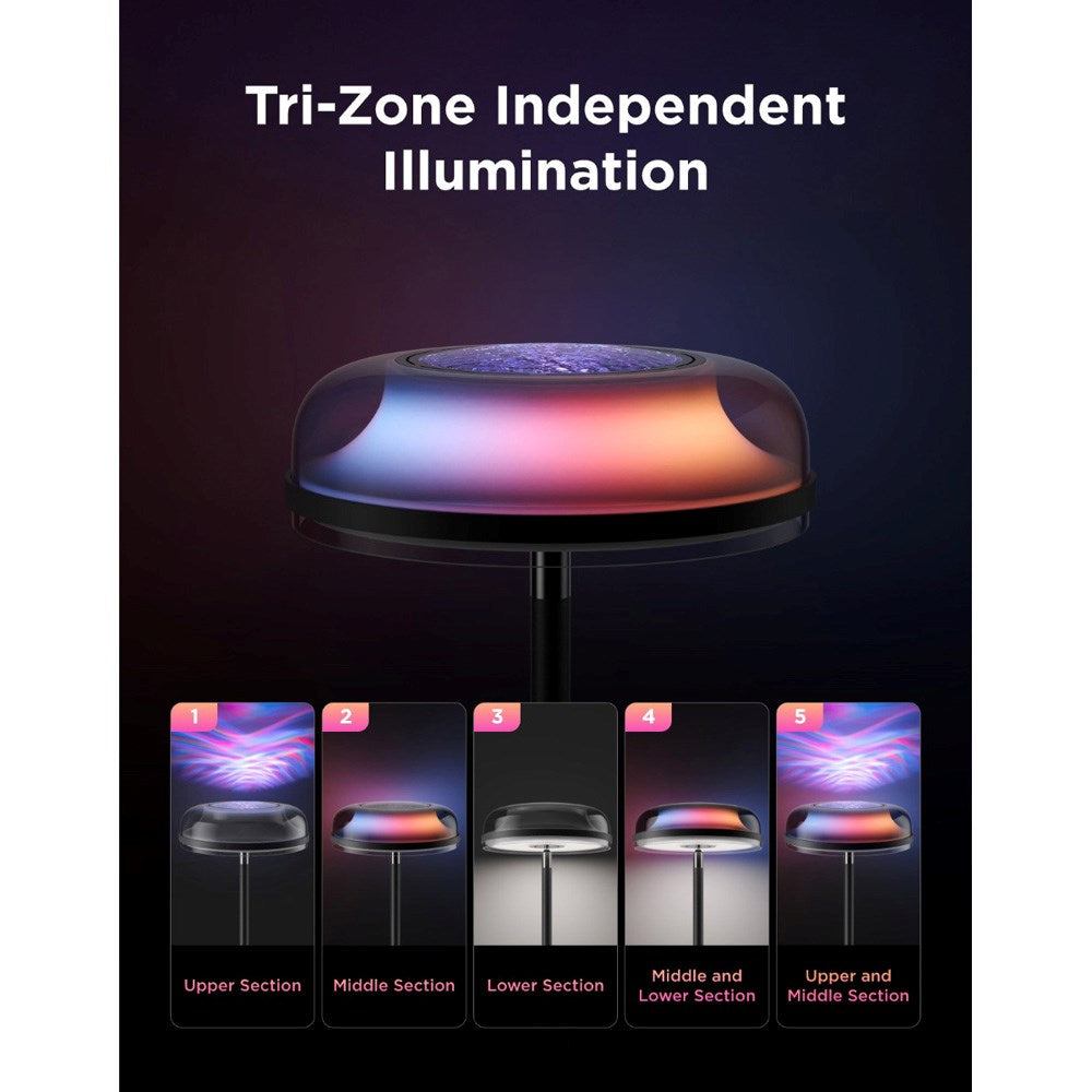 Färg, ljusstyrka och färgtemperatur kan justeras efter behov, eller så kan du välja en av de många förinställda ljusscenerna för en snabb lösning. Med en ljusstyrka på 1000 lumen och en färgtemperatur från 2200 till 6500K kan lampan ge allt från varmt, mysigt ljus till kallt, klart arbetsljus. Den stöder RGBICWW-färger och erbjuder mer än 80 förinställda ljus- och ljudscener.