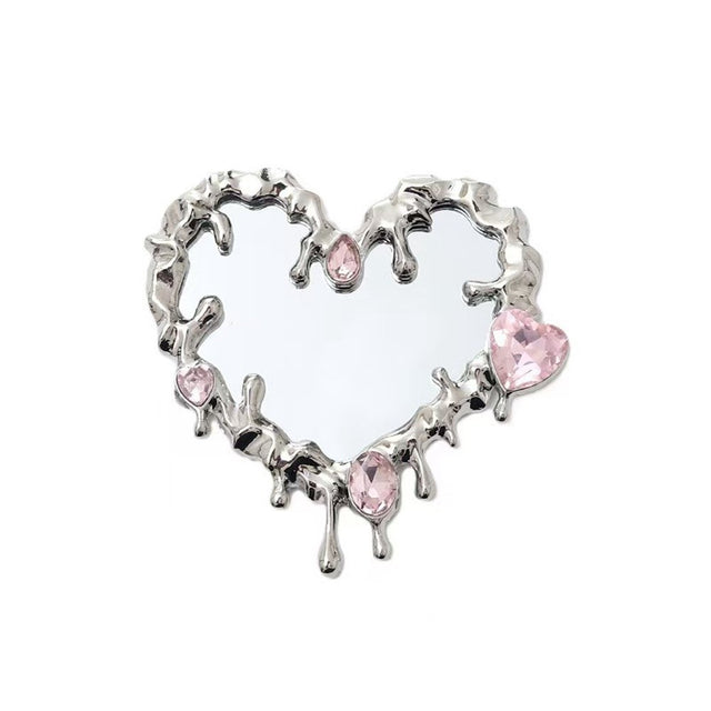 Den lilla spegeln är formad som ett elegant hjärta som ser ut att smälta och är dekorerad med rosa stenar. Spegeln mäter 5 x 5,3 cm och ser bra ut på alla telefoner.