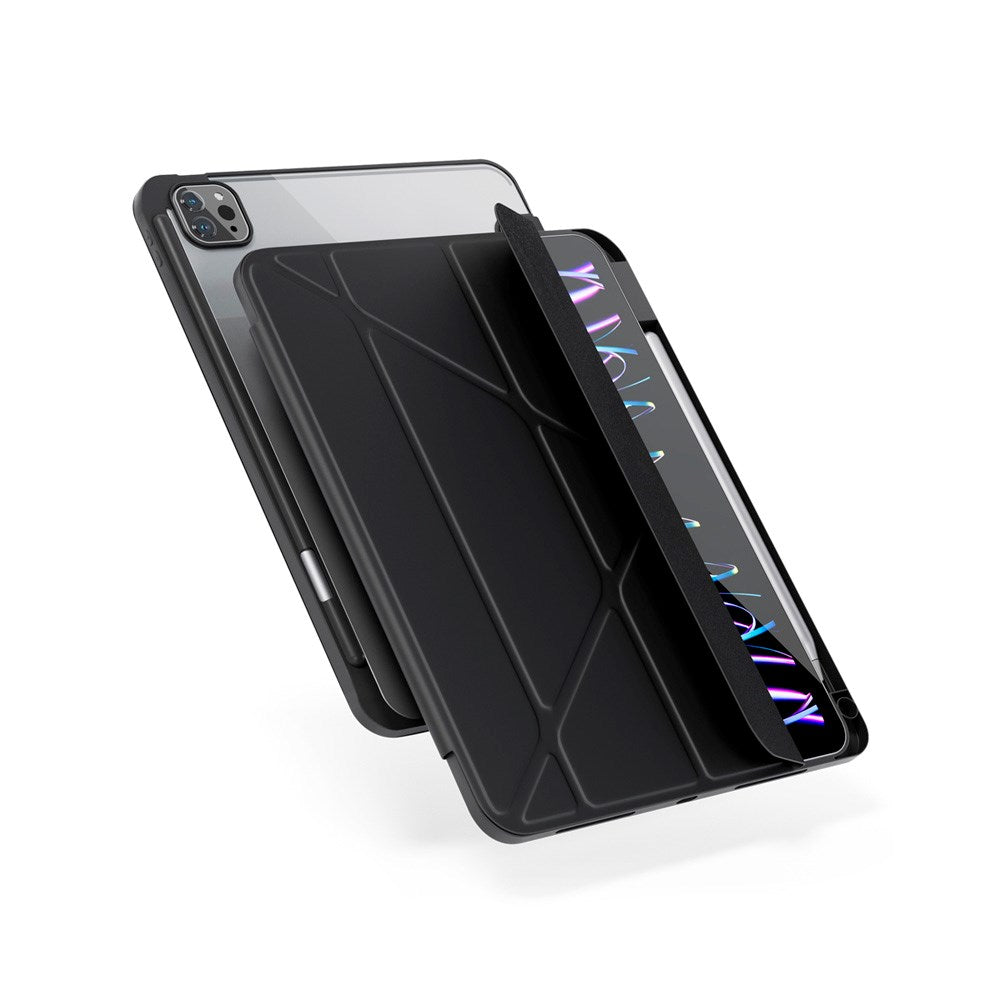 Med sitt smarta, multifunktionella design kan fodralet vikas ut till en tri-fold-stativ som ger dig optimal betraktningsvinkel, oavsett om du arbetar eller kopplar av med underhållning. Det origami-inspirerade designen är inte bara stilfull, den är också praktisk och ergonomisk. Baksidan av fodralet är tillverkad av stötabsorberande, flexibel plast som effektivt skyddar din iPad mot oavsiktliga stötar och fall. Den genomskinliga baksidan låter dig visa din iPads originaldesign samtidigt som den skyddas mot repor och skador.