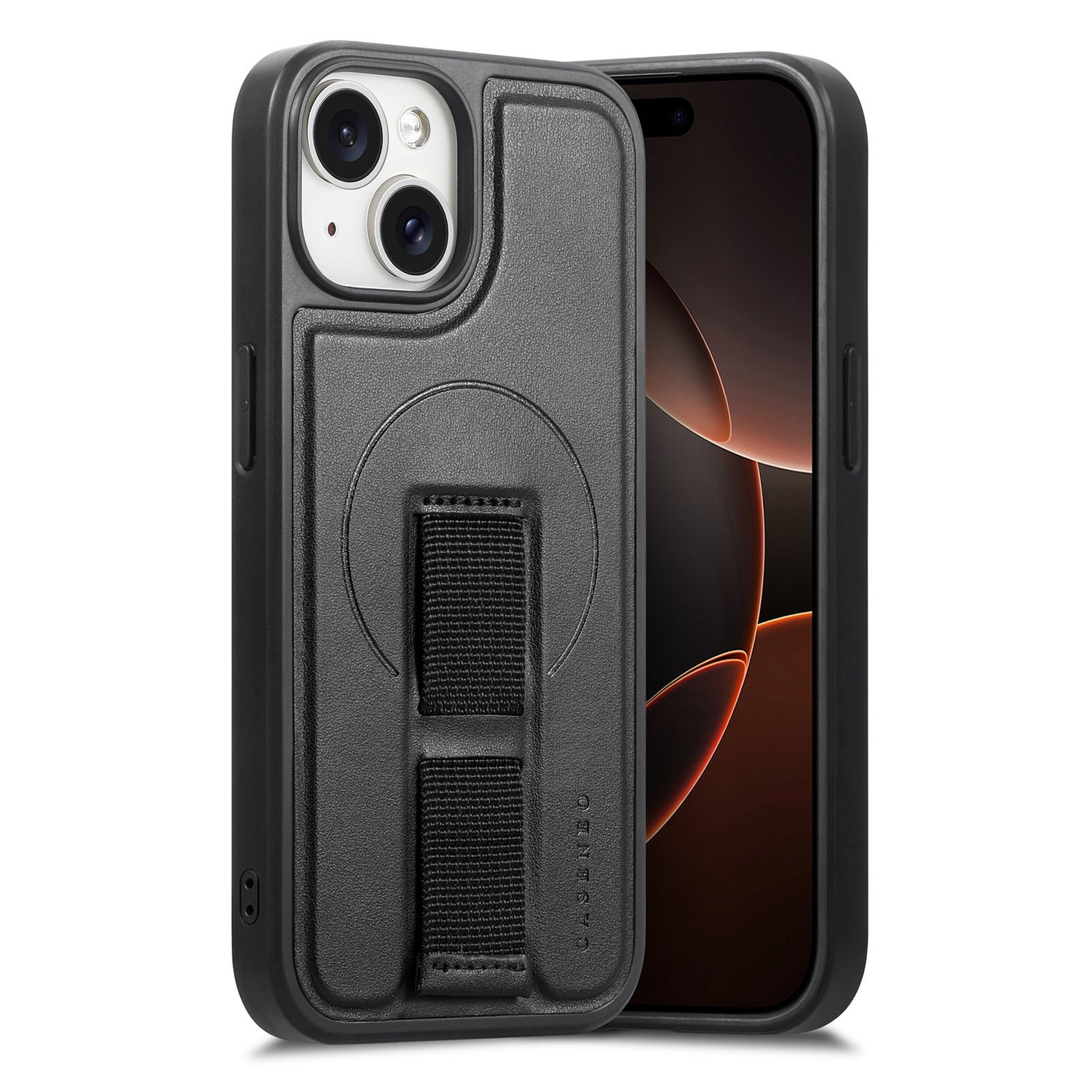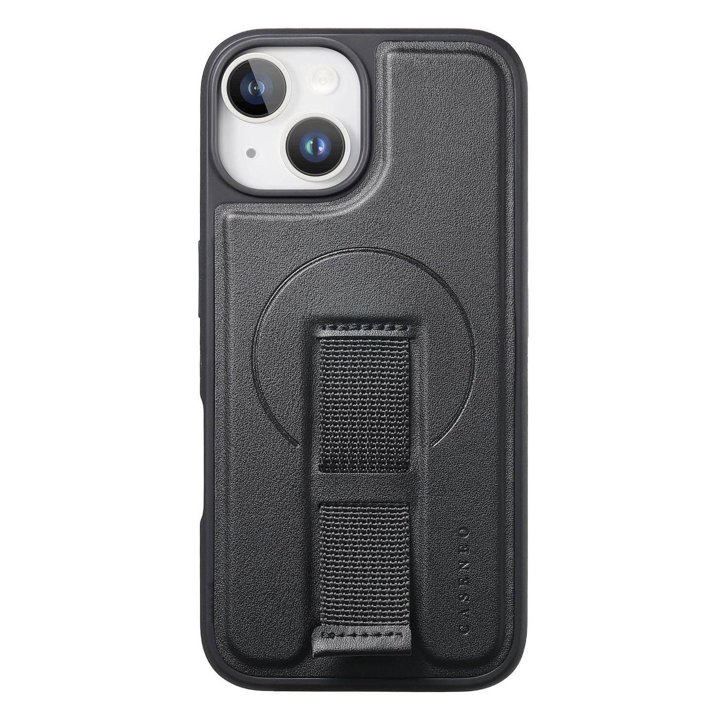 iPhone 14 / 13 Hård Plast Skal m. Konstläder Baksida & Fingerrem - MagSafe Kompatibel - Svart