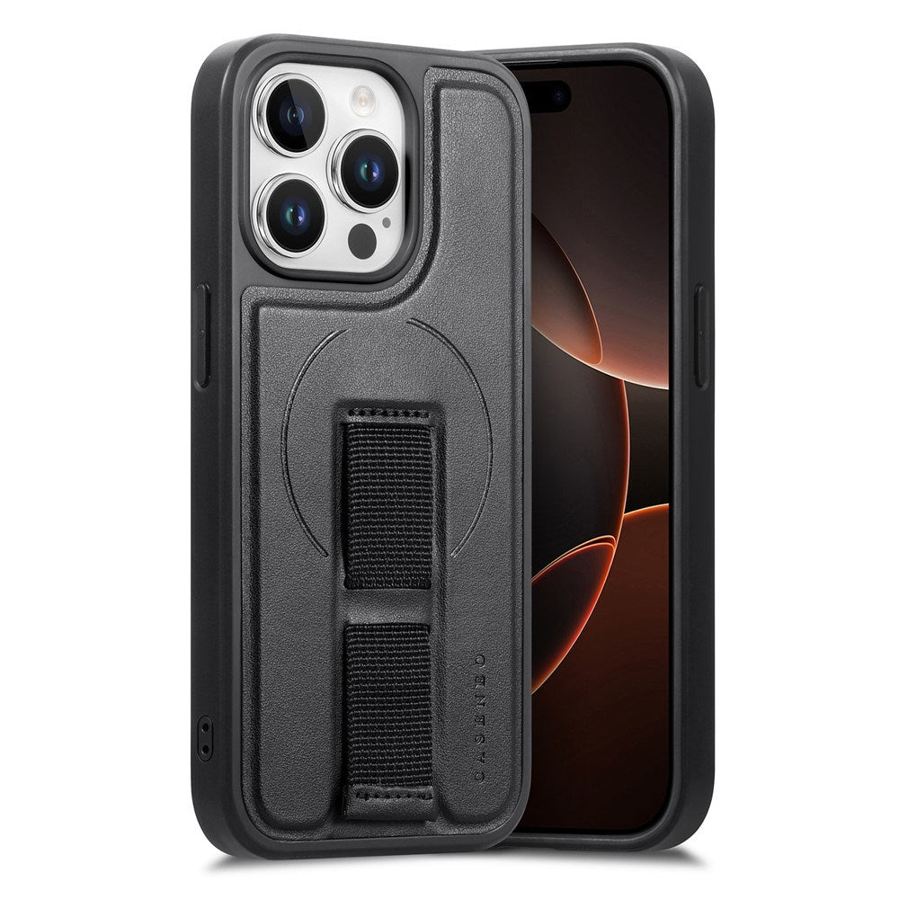 iPhone 14 Pro Hård Plast Skal m. Konstläder Baksida & Fingerrem - MagSafe Kompatibel - Svart