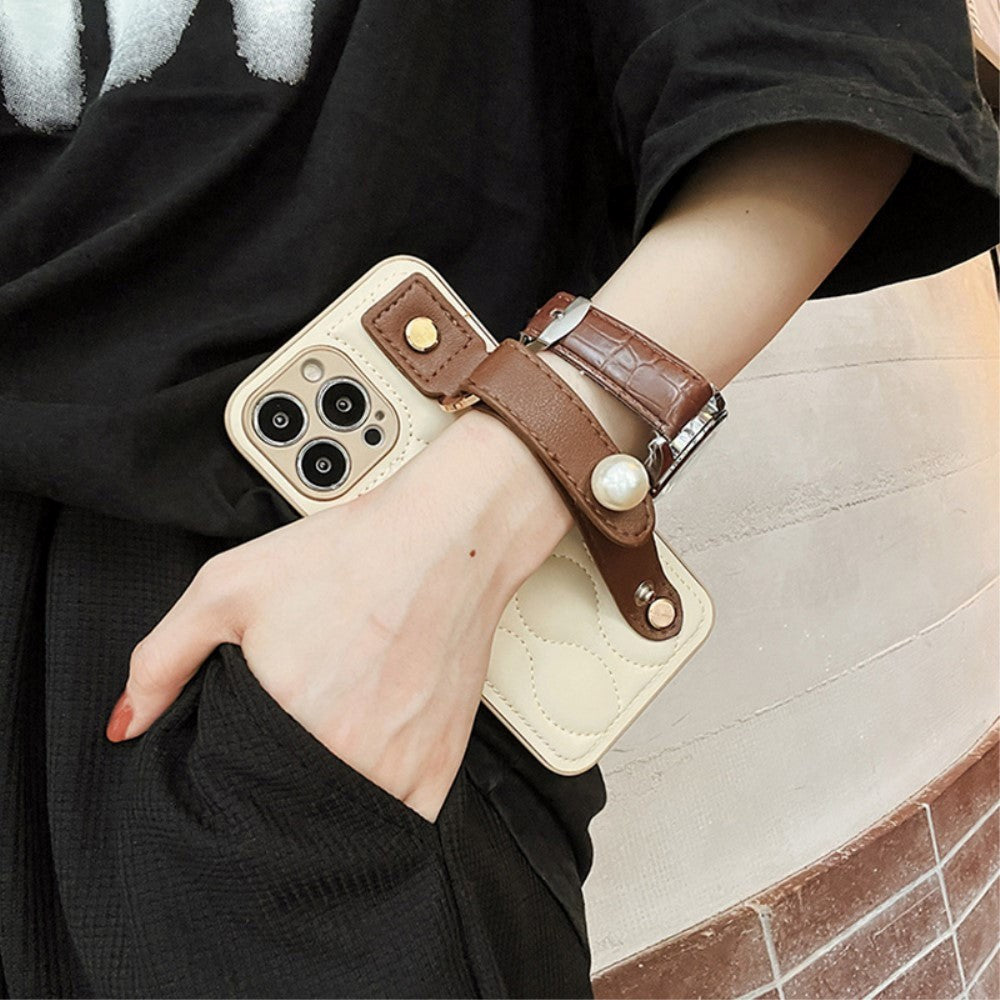 Ett snyggt mobilskal för iPhone 14 Pro som är belagt med konstläder, så att du har ett bra grepp om telefonen. En rem, även den gjord i konstläder, är fäst på skalets baksida.