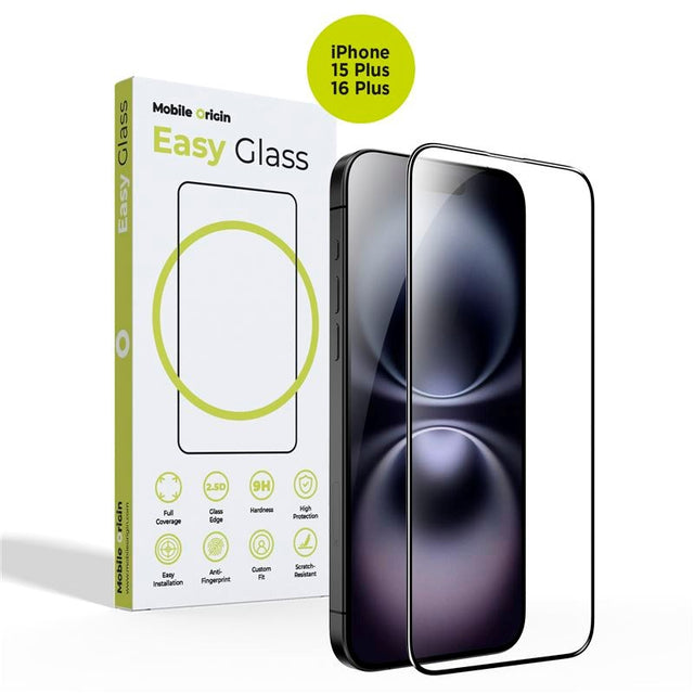 iPhone 15 Plus / 16 Plus Mobile Origin EasyGlass Skärmskydd - Genomskinlig / Svart Kant