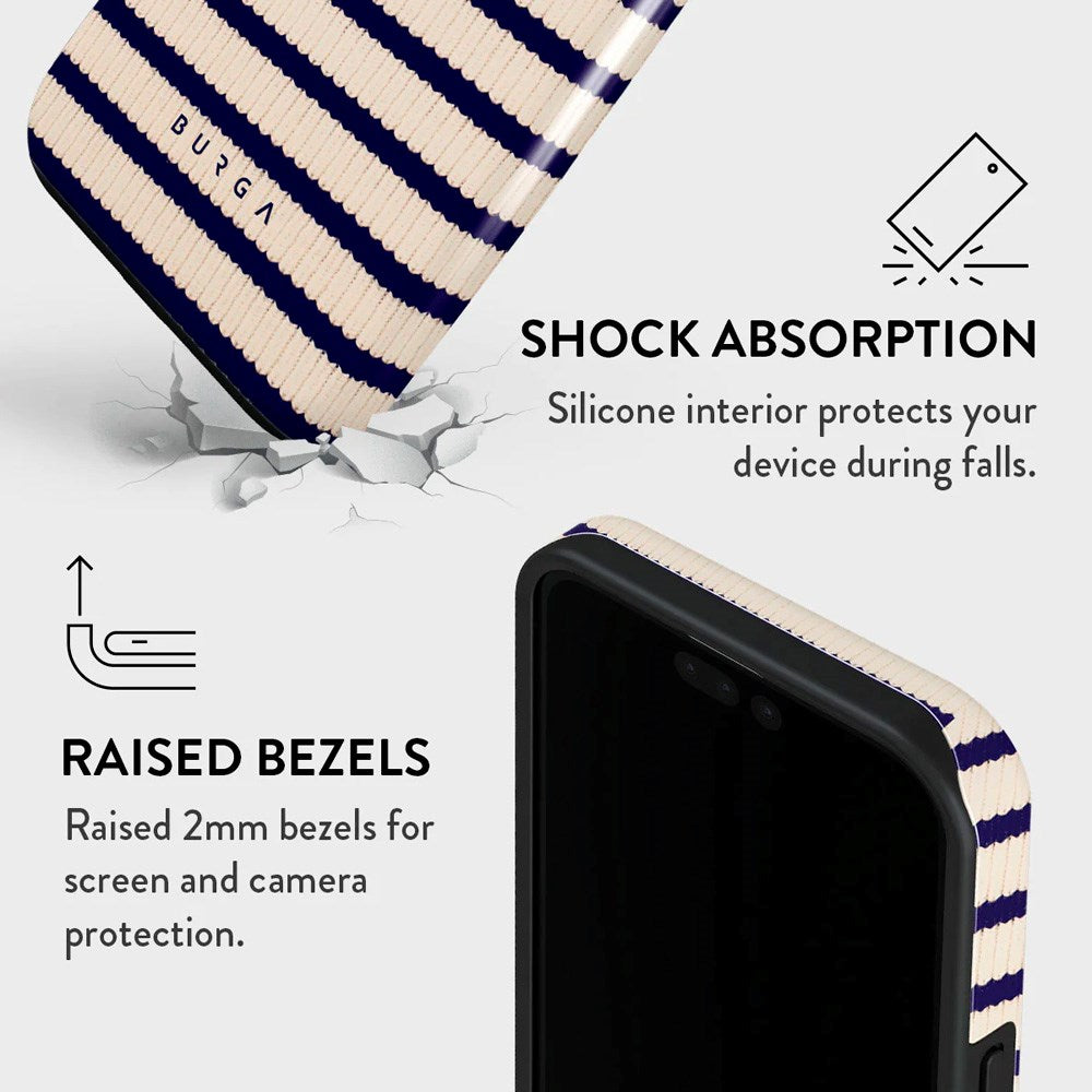 I kombination med skalets exceptionella visuella design, har Burga gett skalet en unik skyddsfunktion. Skalet är tvådelat, där den ena delen består av ett unikt designat skal av hård plast och insidan är producerad i ytterst skyddande stötdämpande silikon.