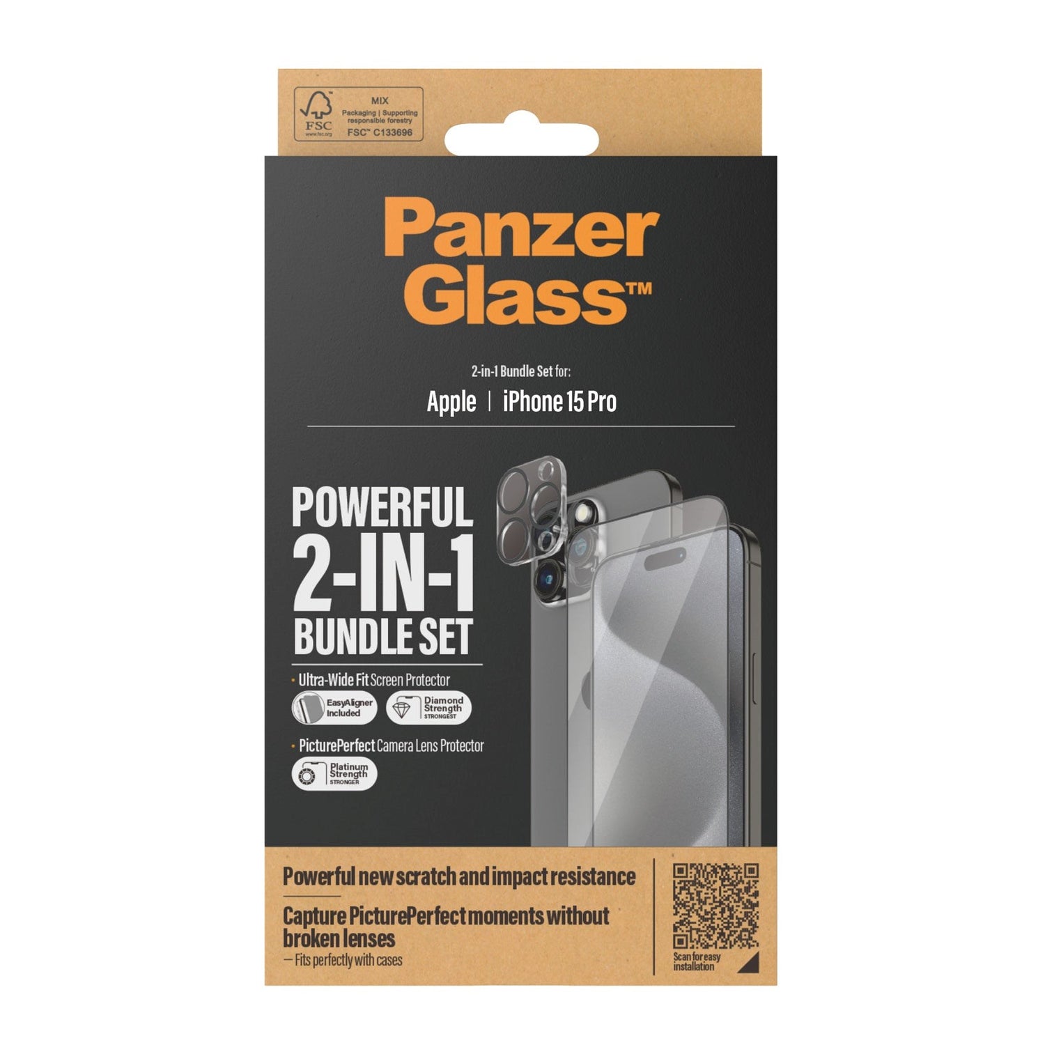 iPhone 15 Pro PanzerGlass 2-i-1 Bundle m. EasyAligner - Skärmskydd (UWF) / Kameraskydd - Genomskinlig / Svart