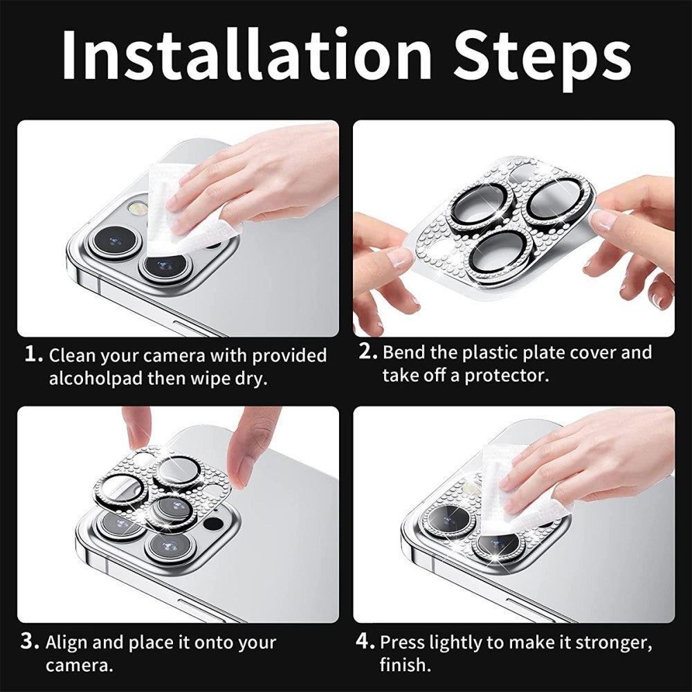 Kameraskyddet är tillverkat av en kombination av plast och glas, som är täckt med ett fint lager strassstenen. Detta kameraskydd skyddar din kameralins mot repor, smuts och andra skador.