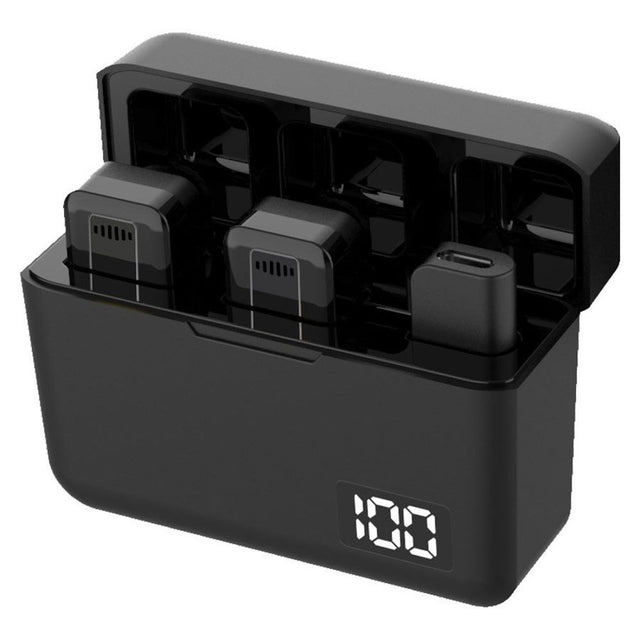 Hela setet levereras i ett laddningsetui, vilket gör det enkelt att hålla koll på delarna och ladda mikrofonerna under tiden – alltid redo för användning.