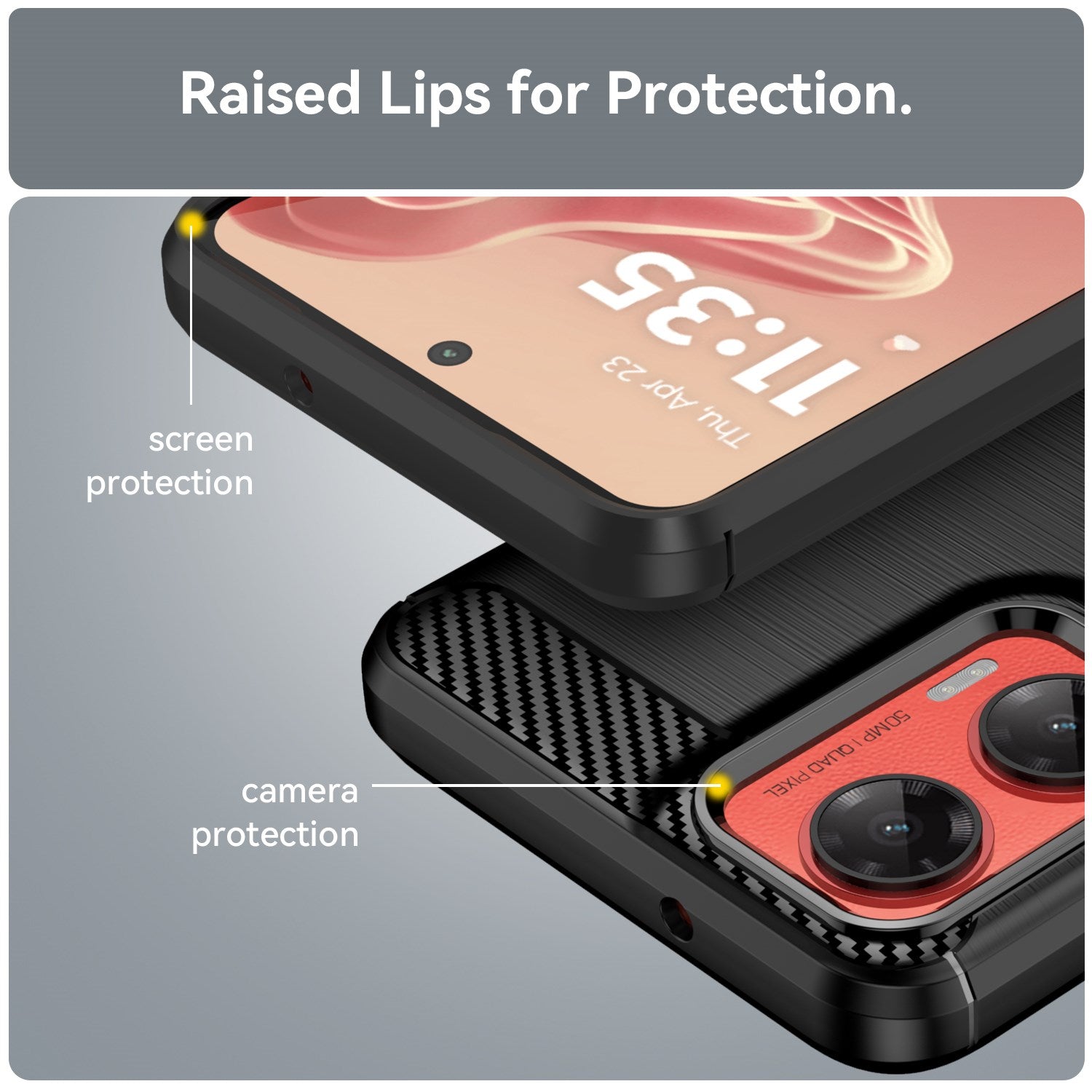 Ett flexibelt plastskydd för Motorola Moto G35 5G som ger bra skydd för din telefon. Detta Motorola Moto G35 5G-skal har ett coolt kolfiberutseende på toppen och botten, kombinerat med en borstad metalllook. Du får ett bra skydd mot repor och skråmor med detta skydd.