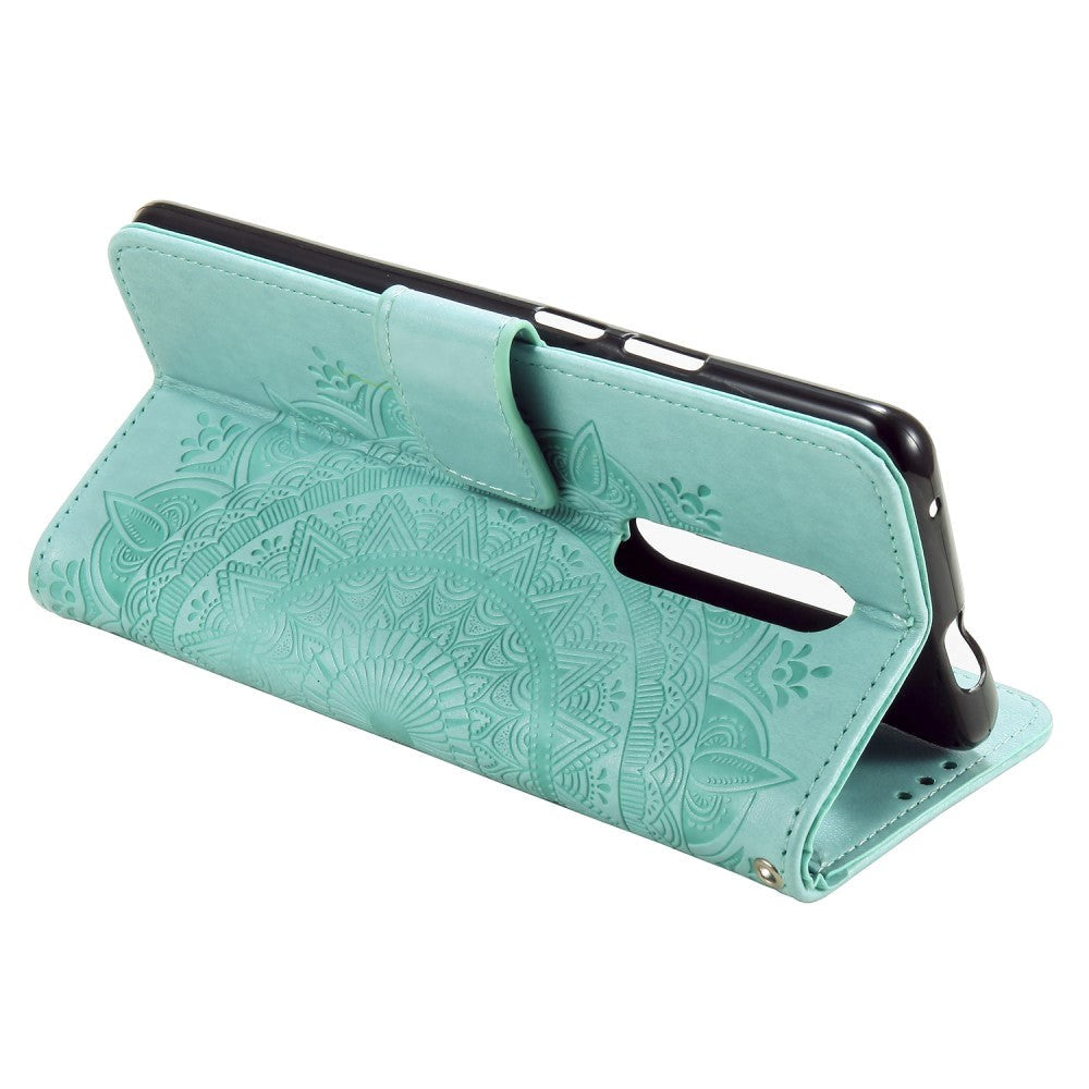 detta Nokia 2.4 skal/fodral är tillverkat av syntetiskt läder, och inuti fodralet finns det tre fickor för kreditkort och en stor ficka för sedlar eller liknande, så att du kan hålla dina viktigaste artiklar tillsammans. Fodralet har ett Mandala -mönstermotiv, som kan kännas i strukturen.