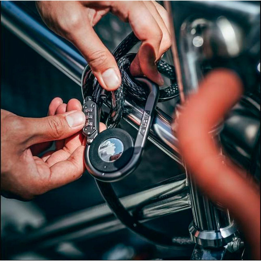 Skalet är försedd med en praktisk metallkarbinhake som har ett inbyggt kombinationslås av stark gjutzink. När den väl är låst med koden är det omöjligt att ta bort din AirTag. Karbinhaken gör det enkelt att fästa skalet på ditt cykellås, resväska och många andra saker.
