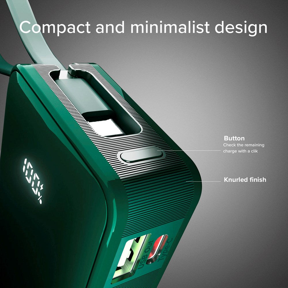 Med ett enkelt tryck på strömbryteren aktiveras den digitala LCD-displayen som visar exakt hur mycket batteri som återstår. När laddningen är låg kan du enkelt ladda upp PowerBanken via den inbyggda kabeln eller USB-C-porten.
