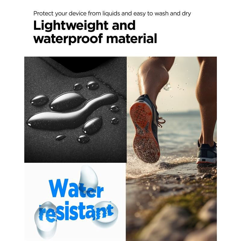 Det vattentåliga yttre nylonmaterialet skyddar mot svett och lätt regn, vilket håller din telefon säkert skyddad och torkar snabbt.