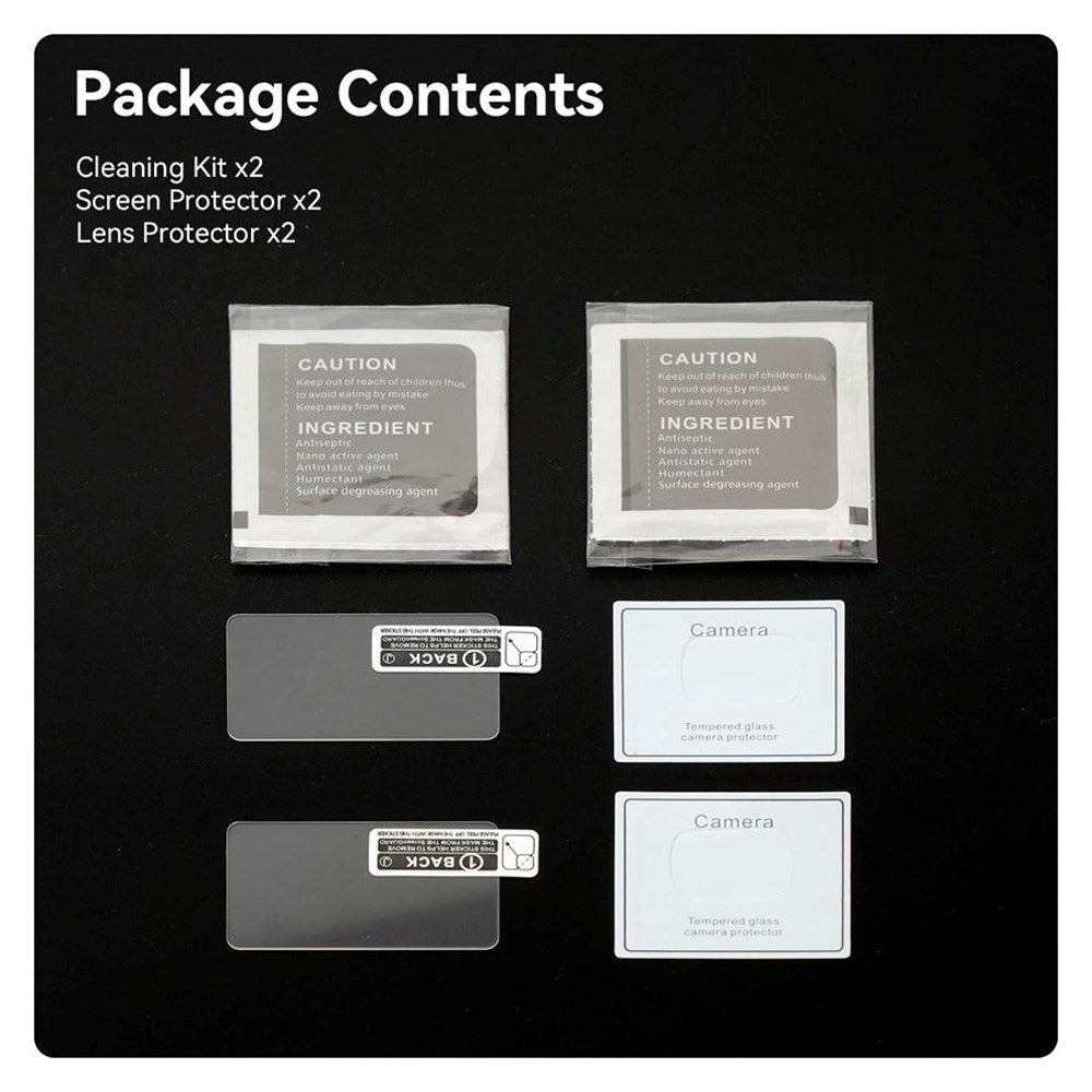 Setet innehåller två uppsättningar skyddsfilmer samt rengöringskit, vilket gör det enkelt och bekvämt att byta skydd när det behövs. Den precisa passformen och enkla installationen säkerställer att glaset sitter perfekt på linsen och skärmen utan irriterande bubblor.