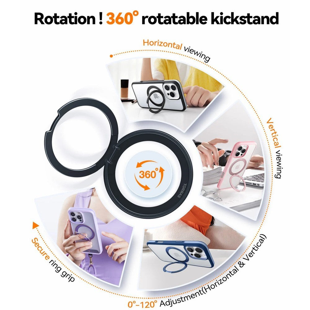 På baksidan av detta iPhone 16 Pro-skal finns en metallmagnetring med två smarta funktioner: stöd och MagSafe-kompatibilitet. Metallringen kan fällas ut och roteras 360°, så att vinkeln kan justeras och anpassas efter dina behov. Den inbyggda MagSafe-magneten gör det möjligt att använda olika tillbehör, som till exempel en trådlös laddare.