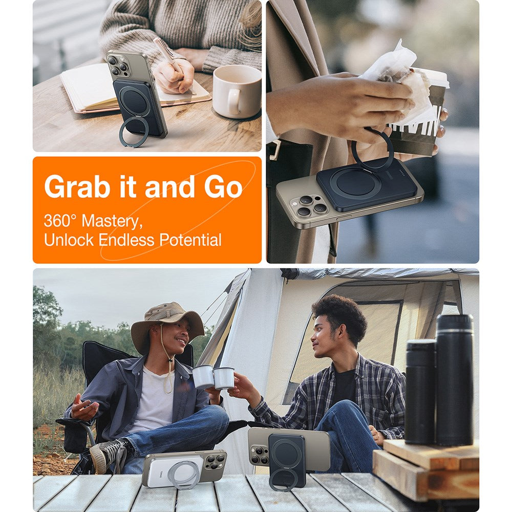 På baksidan av powerbanken finns ett utfällbart stöd (kickstand) som kan justeras efter behov, så både powerbanken och din telefon kan stå upp. Stödet kan vinklas upp till 120° och roteras 360°, så att du kan hitta den perfekta vinkeln när du till exempel tittar på film eller har videosamtal.