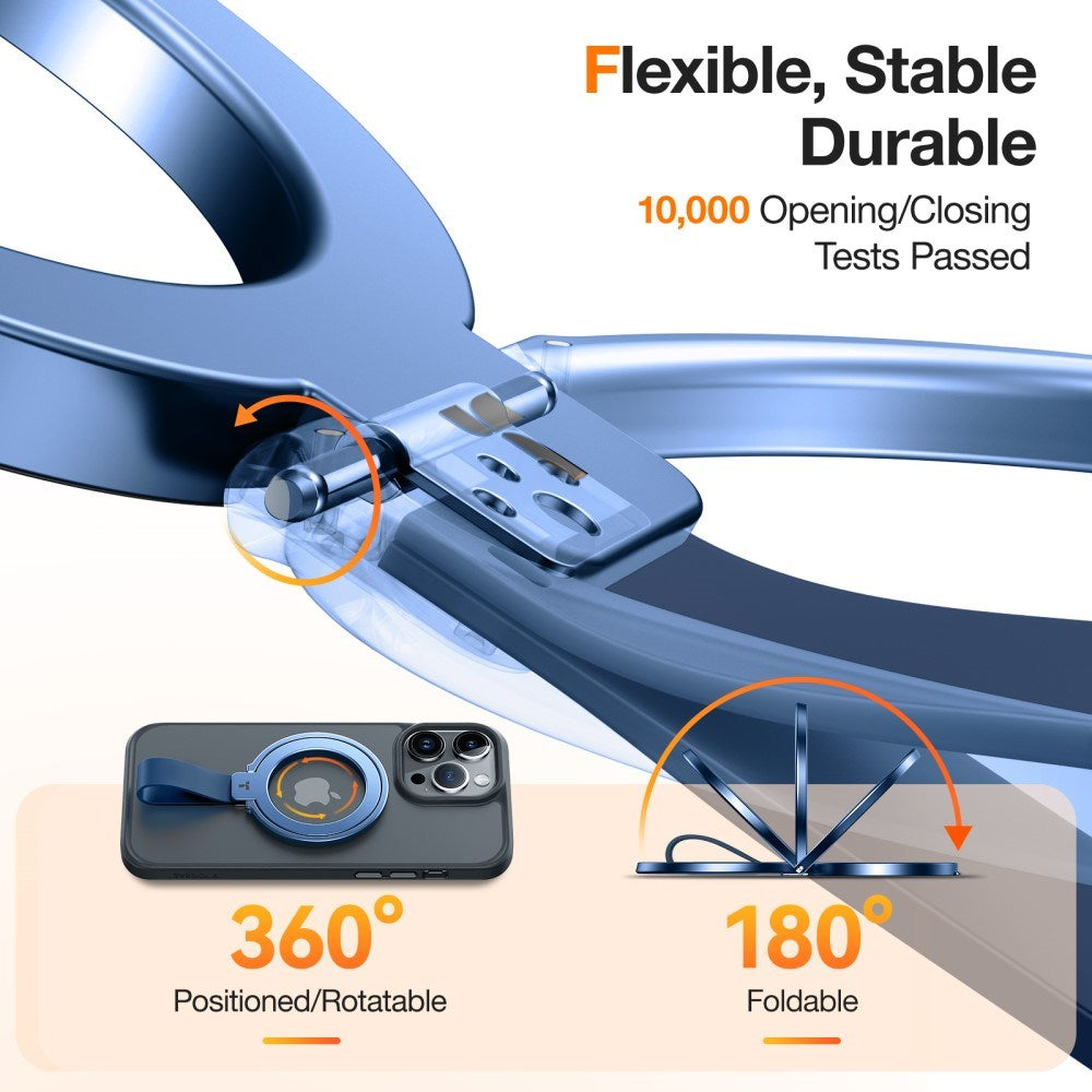 360° Roterbart Kickstand: Denna magnetiska ring kan rotera 360° och justeras till den optimala visningsvinkeln. Använd den som stativ för videor, selfies, meddelanden eller bara som hållare på skrivbordet. Den hopfällbara designen gör det lätt att ha den i fickan när den inte används.