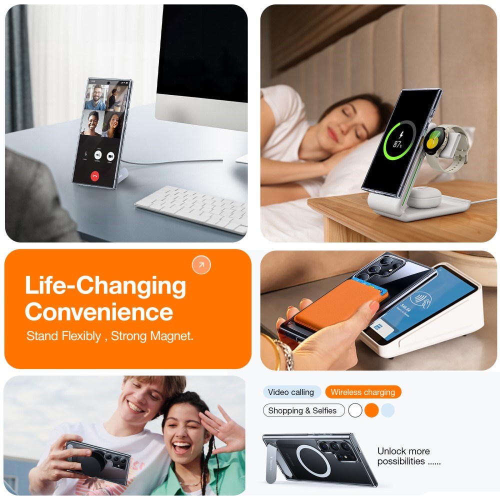 Detta skal är inte bara starkt, utan också praktiskt. Den justerbara kickstanden, som kan justeras från 0-120°, förblir hållbar även efter att ha fällts 40.000 gånger, vilket gör att du kan använda din telefon handsfree medan den laddas.